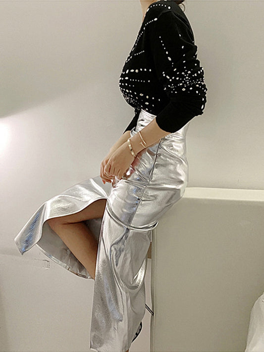 High Waisted Patent Leather Skirt with Slit
