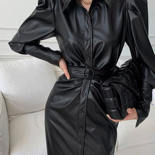 Long Soft Black Faux Leather Shirt Dress with Puff Sleeves